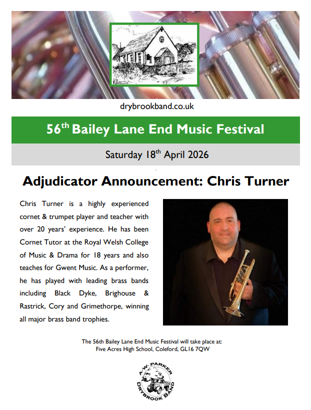 Though the Band took on the running of the Festival in 2010 and focused on brass performance, the event had been in existence for many decades before that. Named after the nearby hamlet of Bailey Lane End, where the festival originated, the event at one time also included other musical forms, such as woodwind, strings and singing, an example of the long musical tradition in the Forest of Dean. Having been run from the Methodist Church in Bailey Lane End, in more recent years the event had then been held in Drybrook Band Room and Forest Church. It was this connection that led the organising committee to approach the band in 2009 and ask if we would take on the Festival. In honour of this long history the name of the event was maintained.